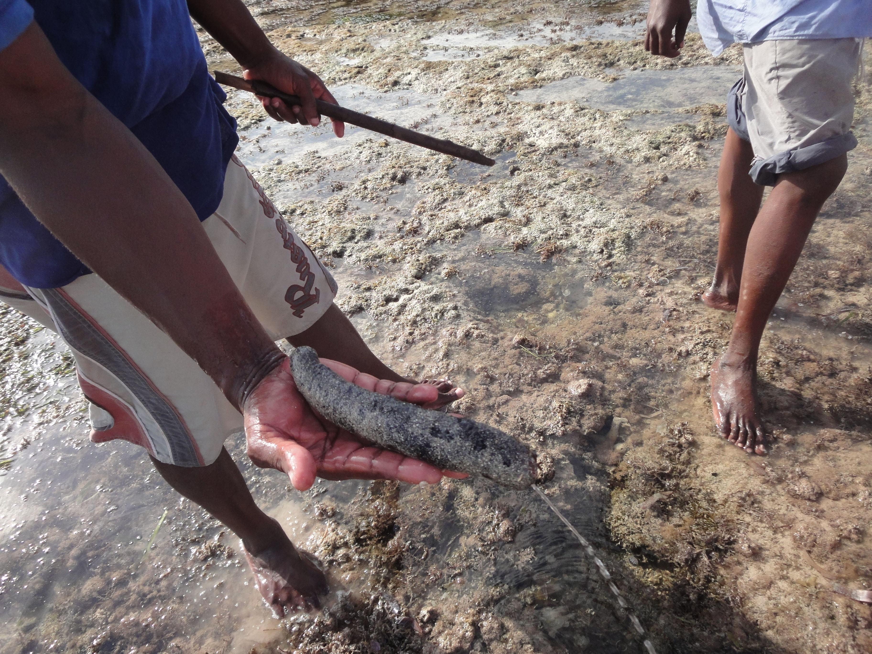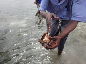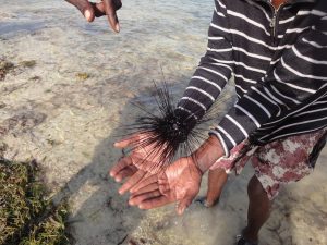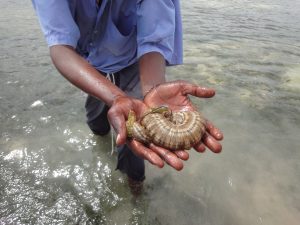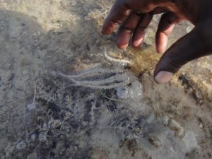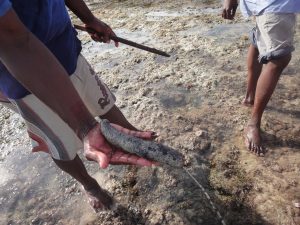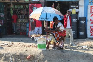 Die in der Mitte unterm Sonnenschirm verkaufte getrockneten Fisch.