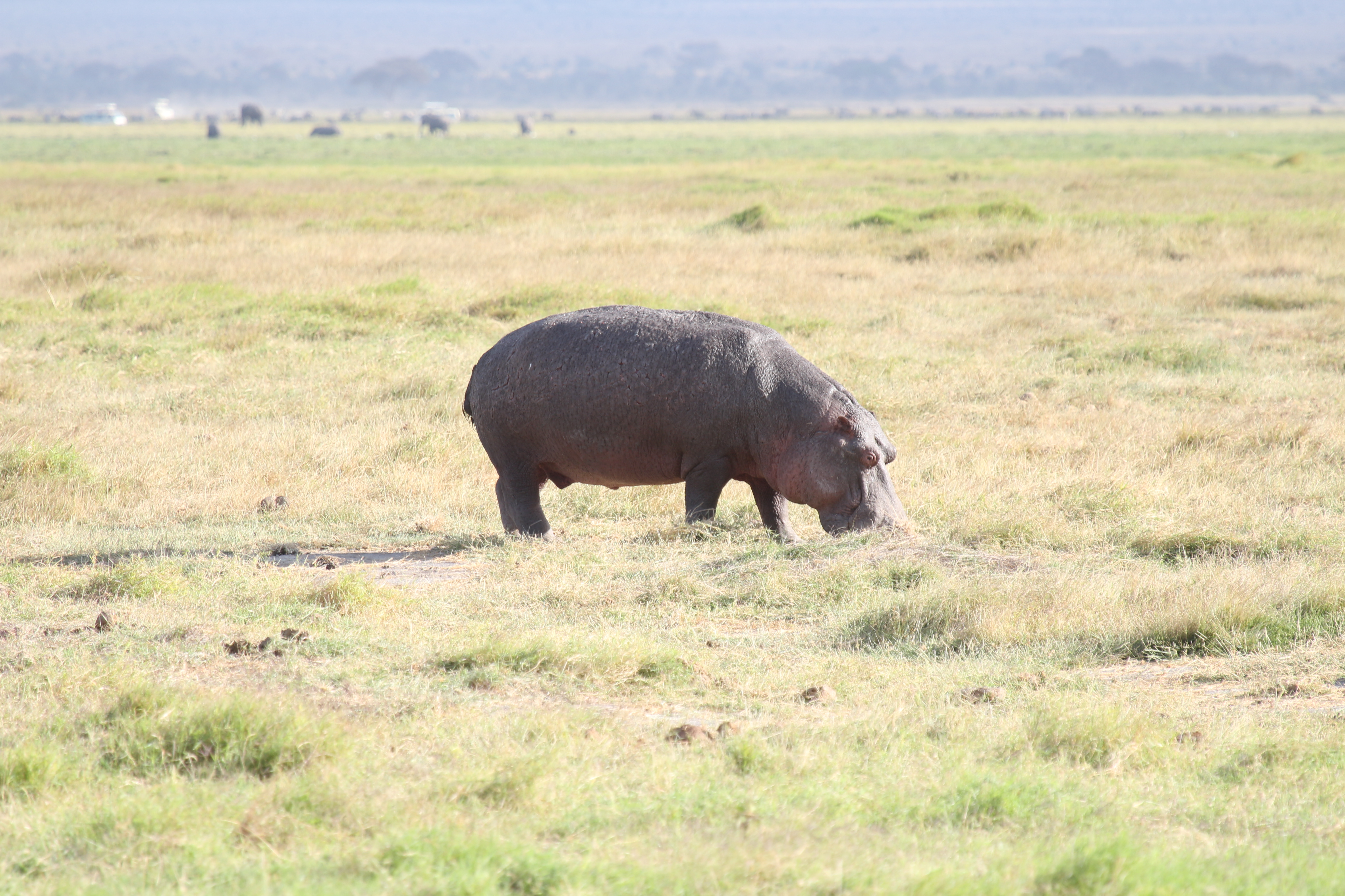 Im erstem Bild wieder der Kilimanjara im Hintergrund über den Wolken, Im zweitem Bild ein Flußpferd im Wasser